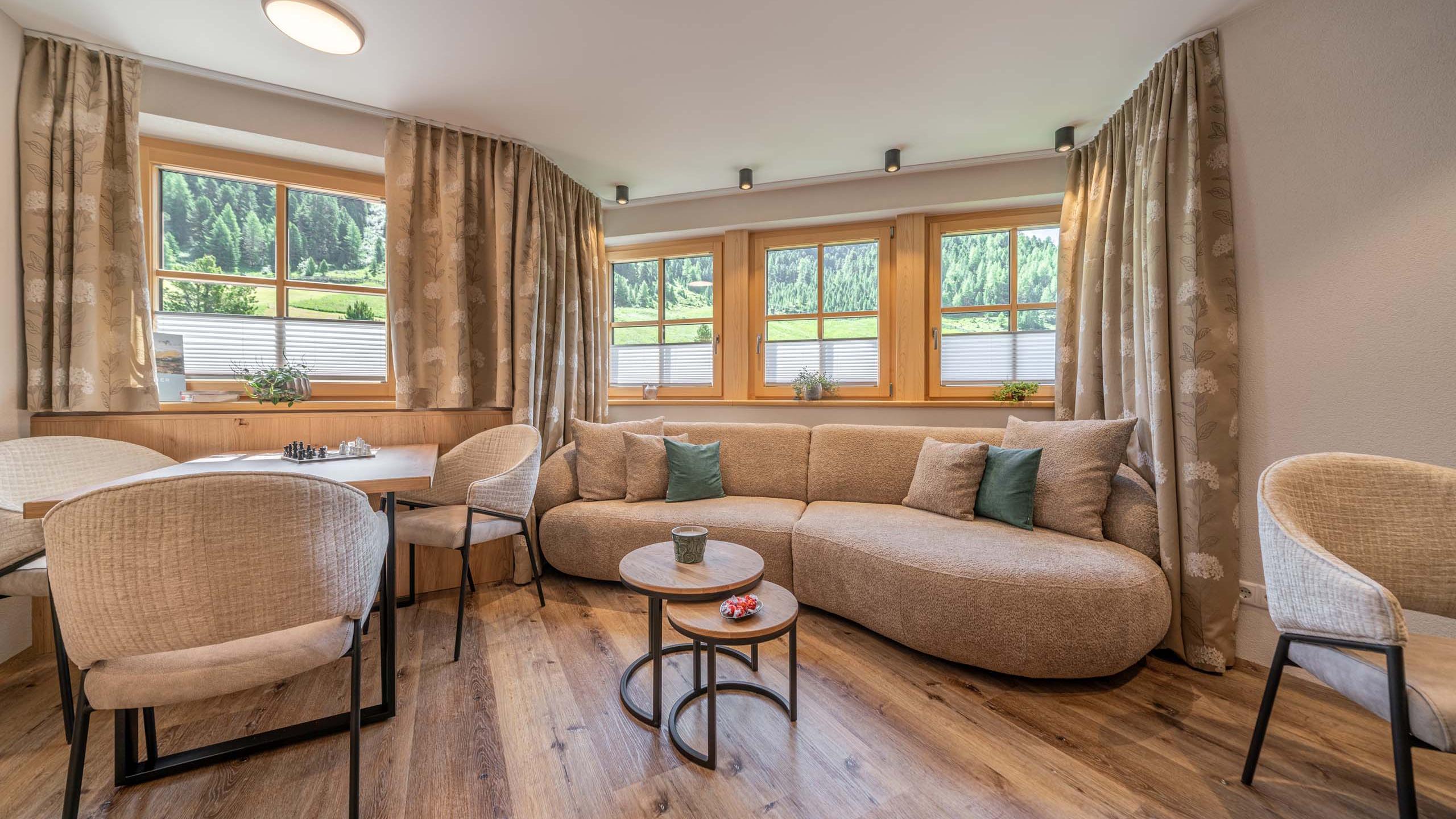 Togetherness at its most wonderful: This apartment is the perfect hideaway for couples looking for a place to switch off and recharge. The sunny southeast-facing terrace will quickly become your favourite spot, with loungers, a table, and an unobstructed, blissful view. Inside await fine materials and an elegant look that make you feel right at home. Soft fabrics, a clean design, and an ambience that exudes a sense of calm make “Ramol” a stylish retreat for two.