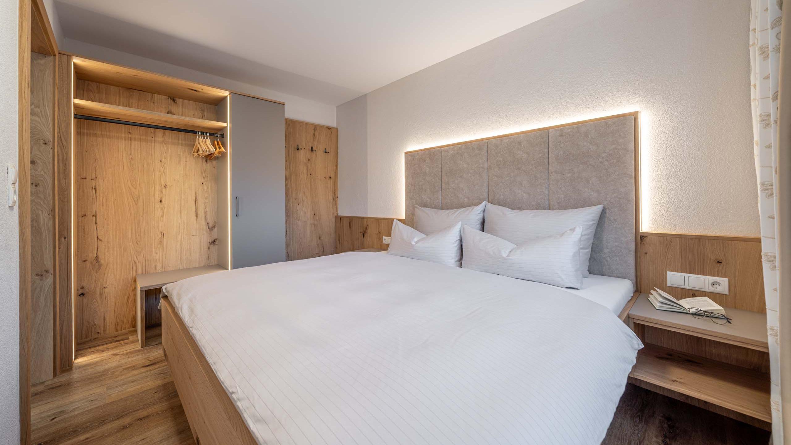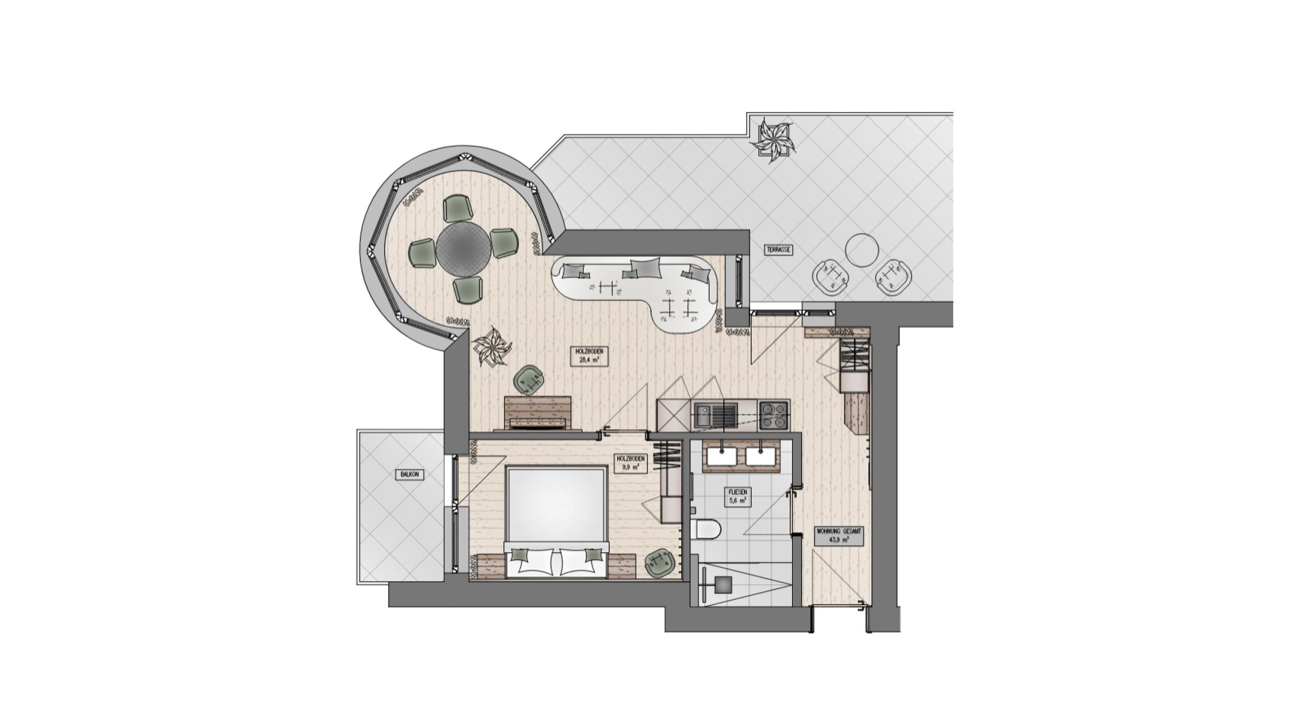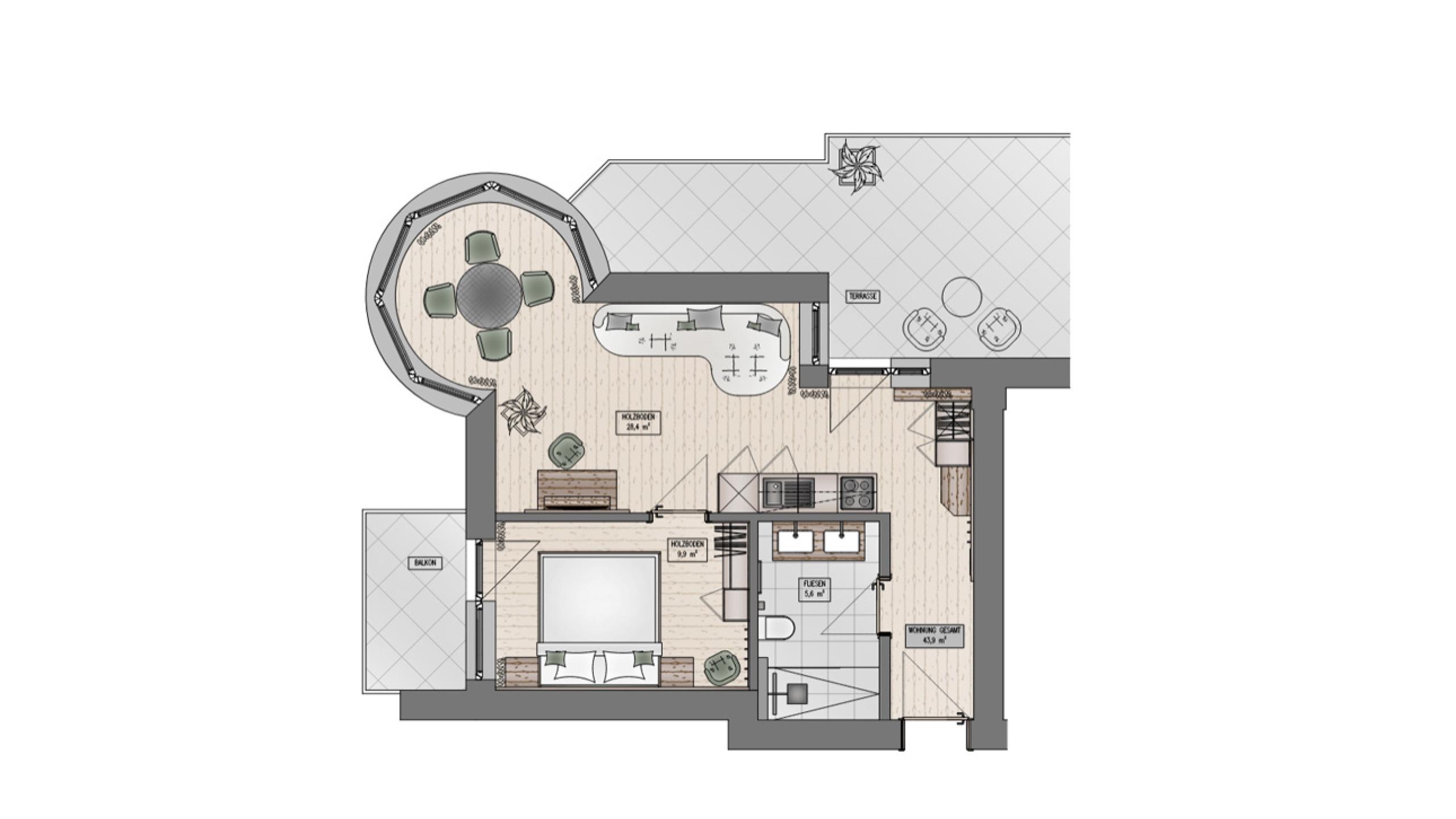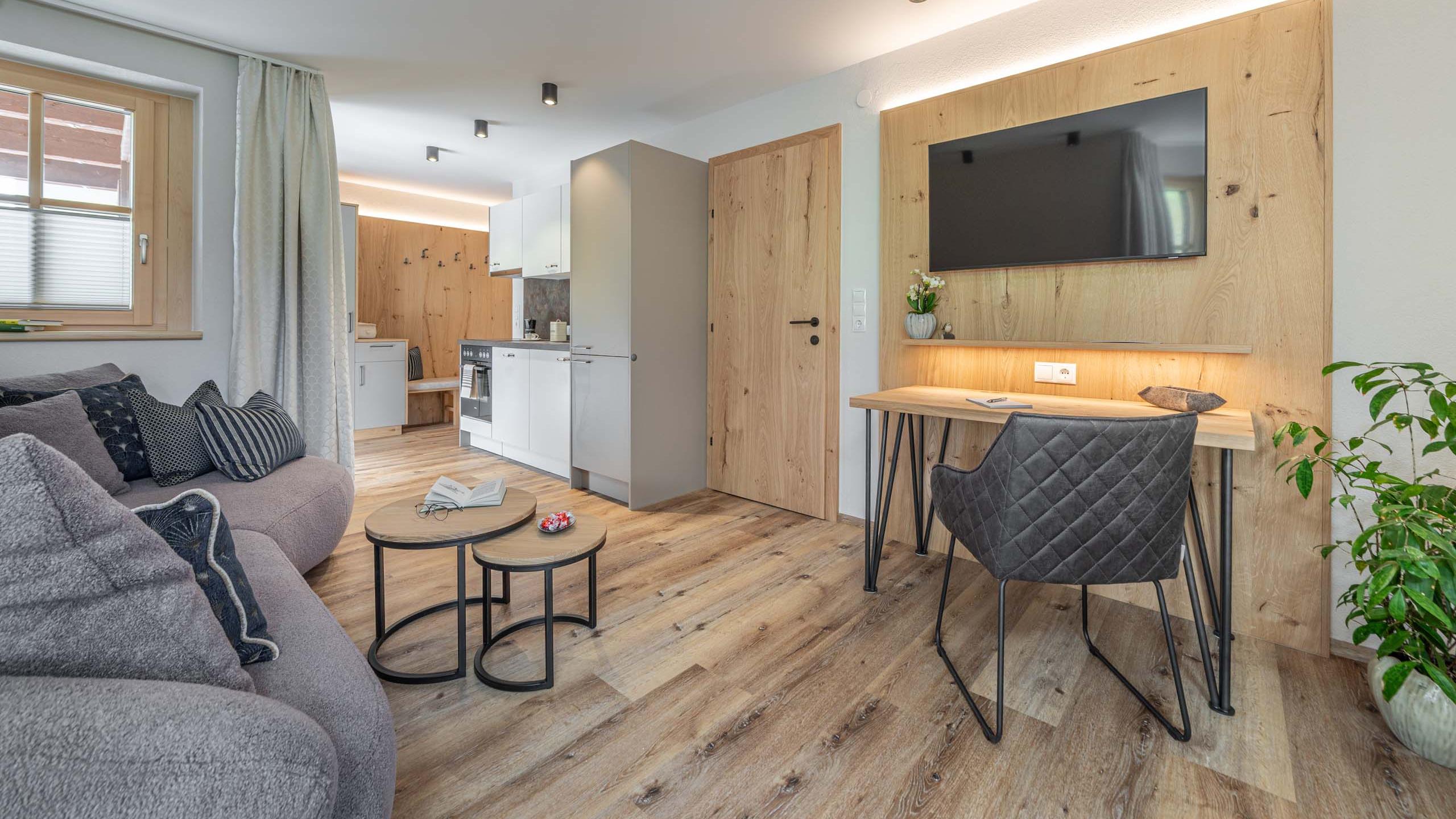 Ein Apartment wie ein gutes Glas Wein: stilvoll, warm und perfekt für zwei. Edle Stoffe und klare Linien schaffen eine Atmosphäre zum Rundum-Wohlfühlen und Ausspannen. Draußen? Wartet die großzügige Südost-Terrasse mit Liegestühlen und diesem einmaligen Gefühl von „Ach, ist es hier schön!“. Drinnen sorgt die voll ausgestattete Küche für Genussmomente, das Bad für Wellness-Feeling.
