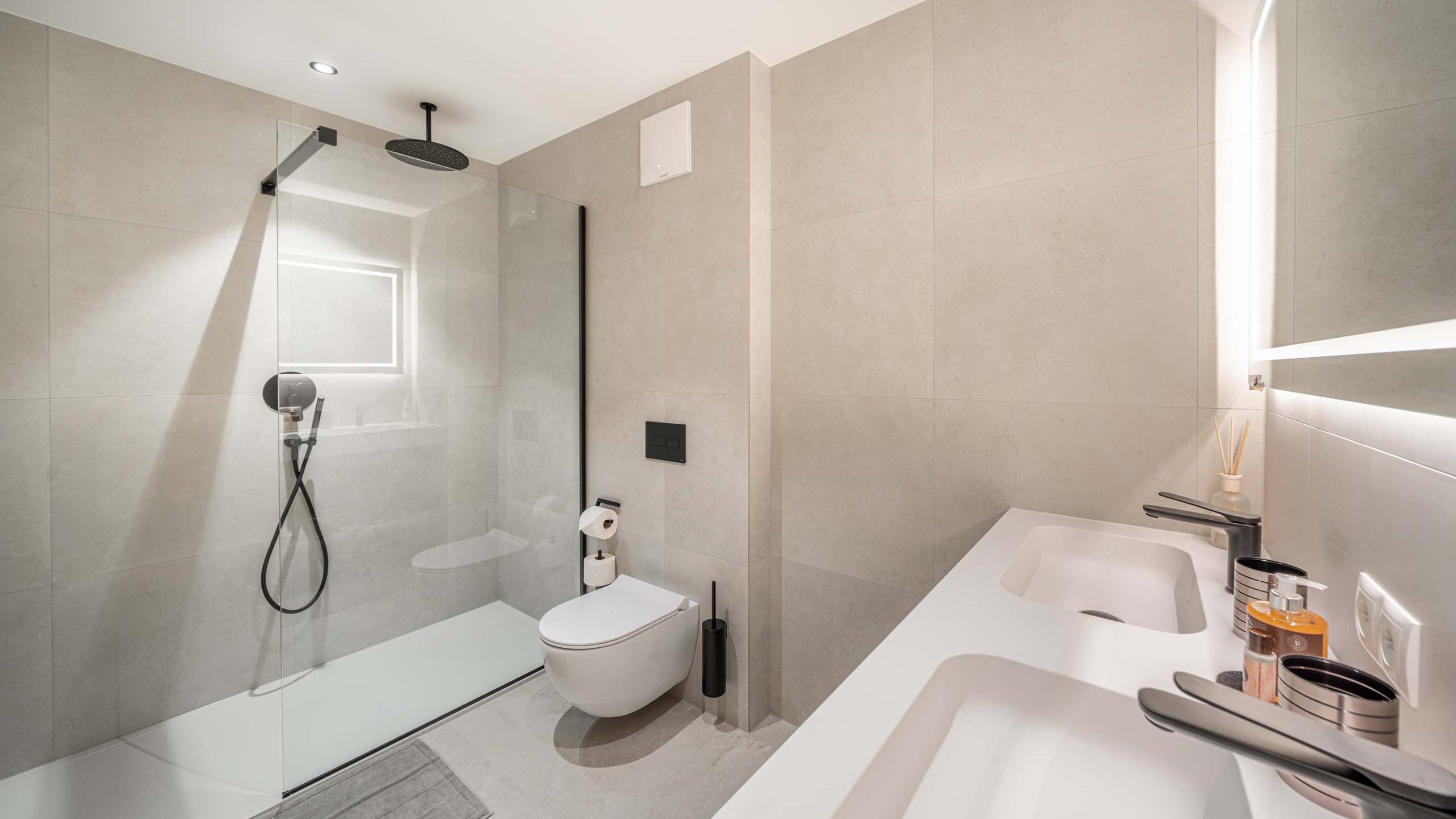 - Badezimmer mit Doppelwaschbecken, Dusche und WC