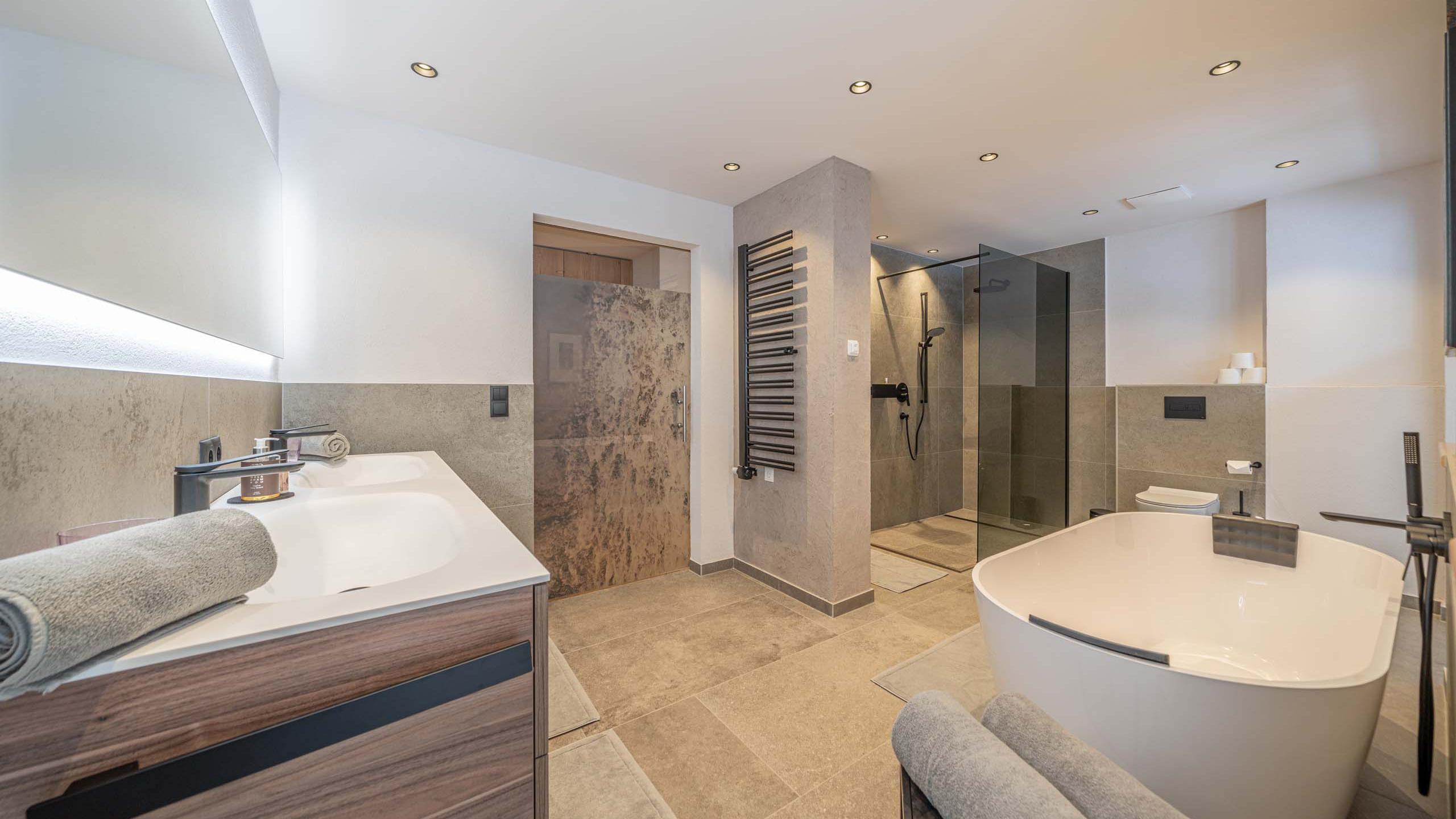 - Großes Badezimmer mit freistehender Badewanne, Doppelwaschbecken, Dusche und WC