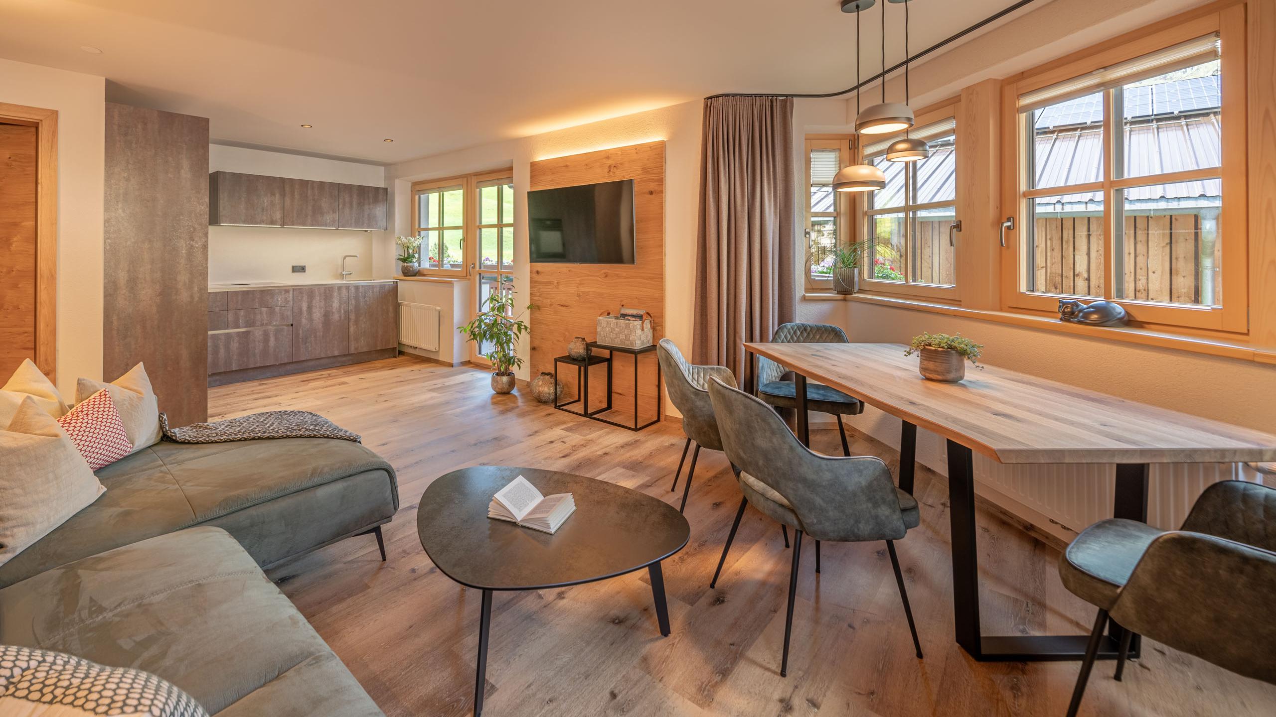 - Großzügiger, südseitig ausgerichteter Wohn- und Kochbereich mit Fernseher